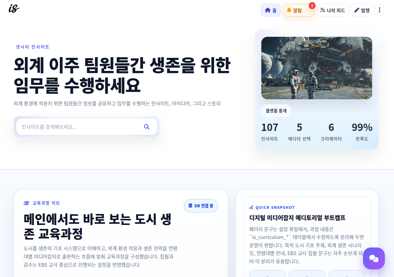 좌측은 팀 대화, 우측은 SNS 피드형 게시판으로 동작합니다. 각 링크 페이지마다 별도의 협업 공간이 유지됩니다.